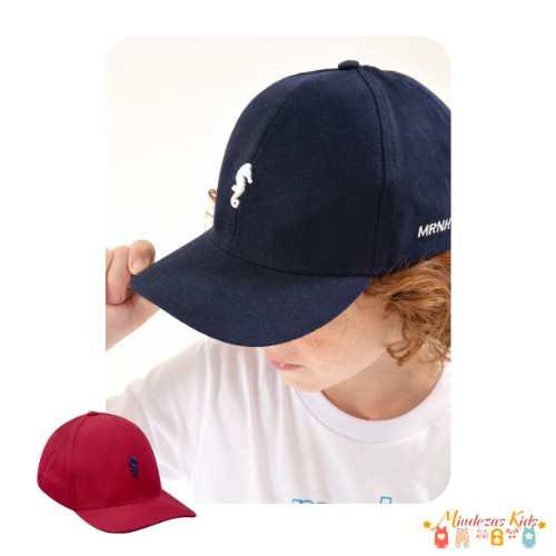 O boné Onda Marinha é confeccionada em sarja, com regulagem em velcro e bordado decorativo da marca (cavalo marinho). É perfeito para proteger do sol e compor um lookinho estiloso. Os meninos vão adorar!