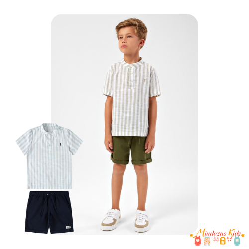O Conjunto de bata em linho leve listrado e bermuda em linho Onda Marinha é perfeito para garantir conforto e muito estilo aos pequenos!