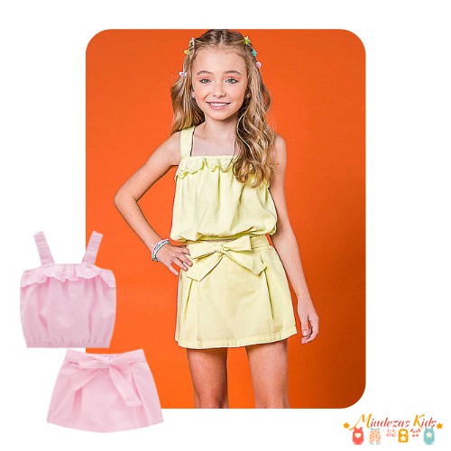 O conjunto de blusa boxy em tricoline napoli e shorts-saia em sarja empapelada Kukie além de lindo é um look divertido que nunca sai de moda, as meninas amam!