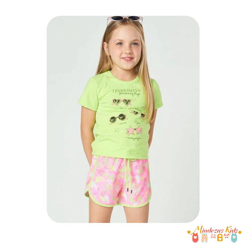 Conjunto de blusa em meia malha e shorts em nylon neon nfanti