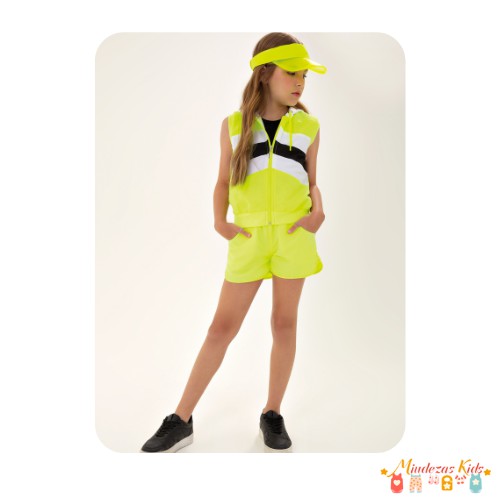 O conjunto de colete bomber e shorts em nylon neon Nina Go é um look super moderninho e estiloso. O colete no modelo bomber possui ajuste em cordão no capuz, fechamneto em ziper, detalhe em recorte com cor contraste. O shorts em tactel possui modelagem tradicional, com bolsos nas laterais e pingente decorativo da marca. Look despojado e perfeito para curtir os dias quentes de verão. As meninas vão amar!