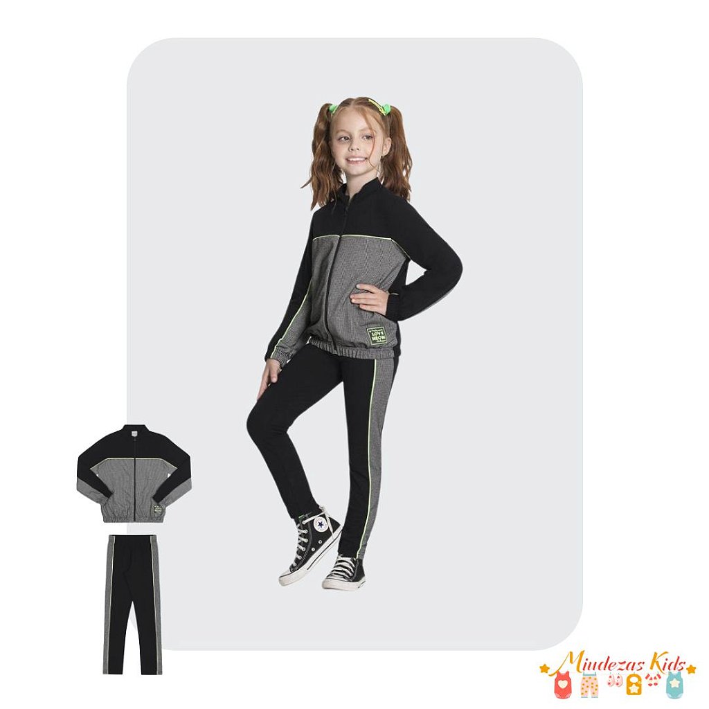 Para as fashionistas de plantão, um conjunto inspirado no estilo esportivo bem moderninho e confortável! Feito em Malha Cotton Soft e Malha Pied Poule com textura diferenciada, a jaqueta tem modelagem bomber com detalhe Neon, enquanto a calça tem elástico no cós e recorte nas laterais. Perfeito para combinar com tênis!