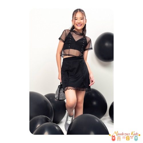 Trio de blusa cropped sobreposição e saia em tule e top cropped em cotton Vic&Vicky